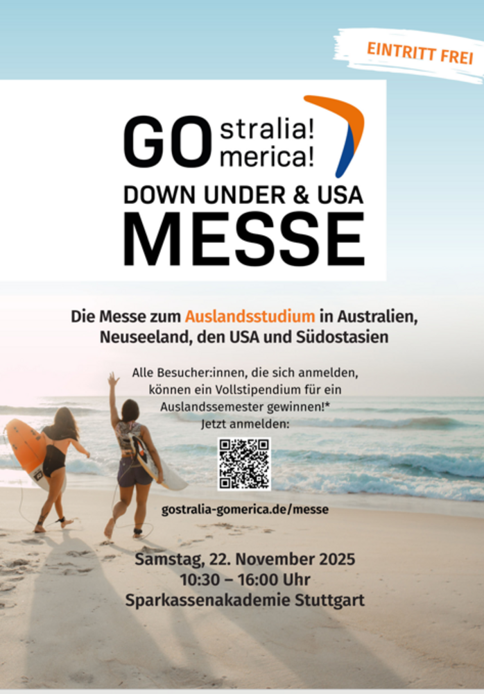For those who can't make it to Stuttgart, there will once again be online information sessions on semesters abroad in Australia, New Zealand, the USA, and Southeast Asia. As usual, students will be informed about the destination countries, study opportunities, the application process, and financing options, including BAföG for studying abroad and many exclusive scholarships.